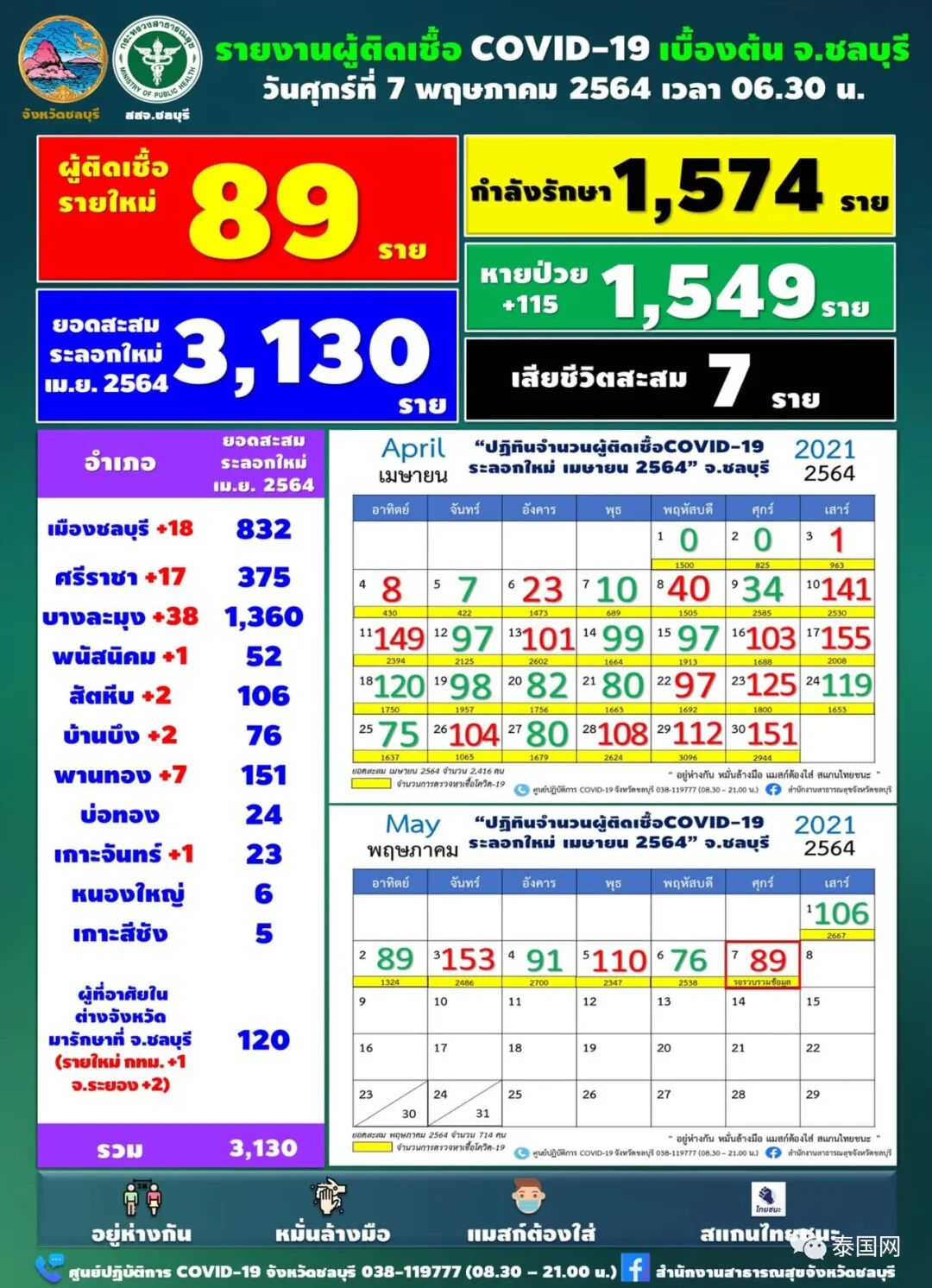据泰国春武里府公共卫生办消息,截至当地时间5月7日06:30,春武里府新增89例确诊病例,包括春武里直辖县18例、是拉差县17例、邦拉蒙县38例、帕那尼空县1例、梭桃邑县2例、班邦县2例、攀通县7例、阁占县1例、曼谷转入治疗1例和罗勇府转入治疗2例。