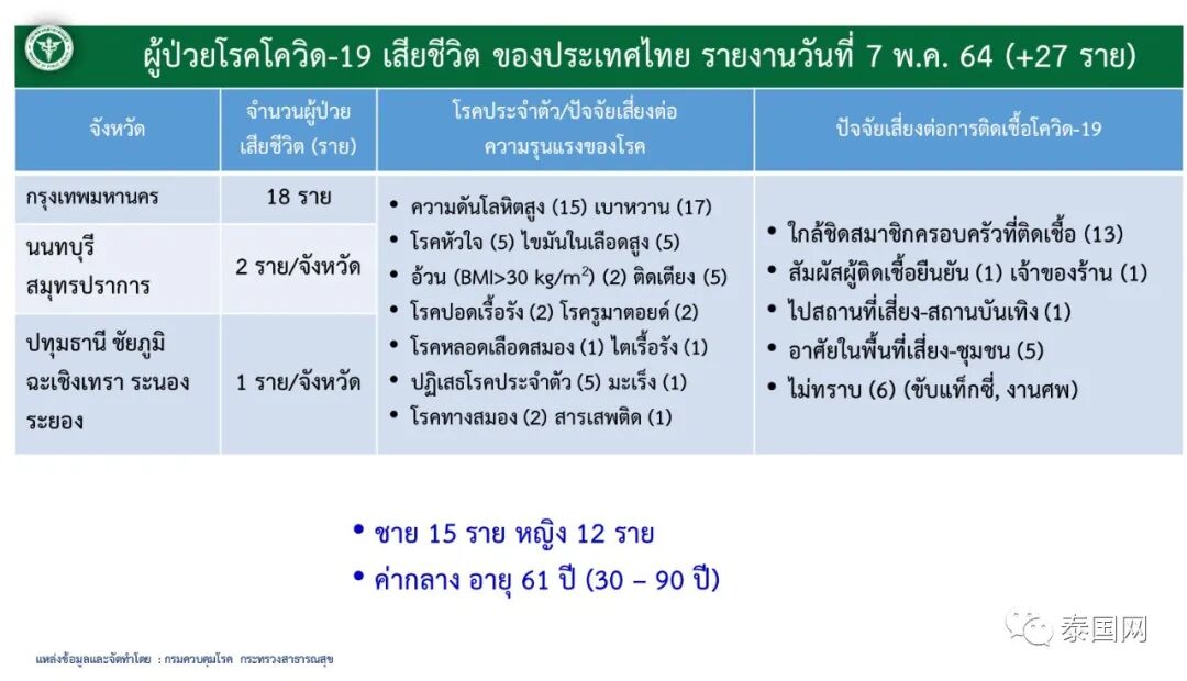 5月7日据泰国疫管中心消息,泰国新增27例新冠死亡病例,包括15名男性和12名女性,死者年龄在30-90岁之间,他们生前大多患慢性病。