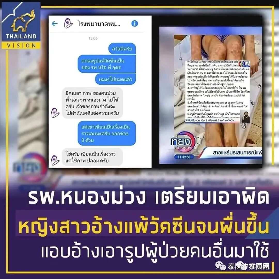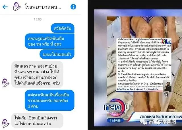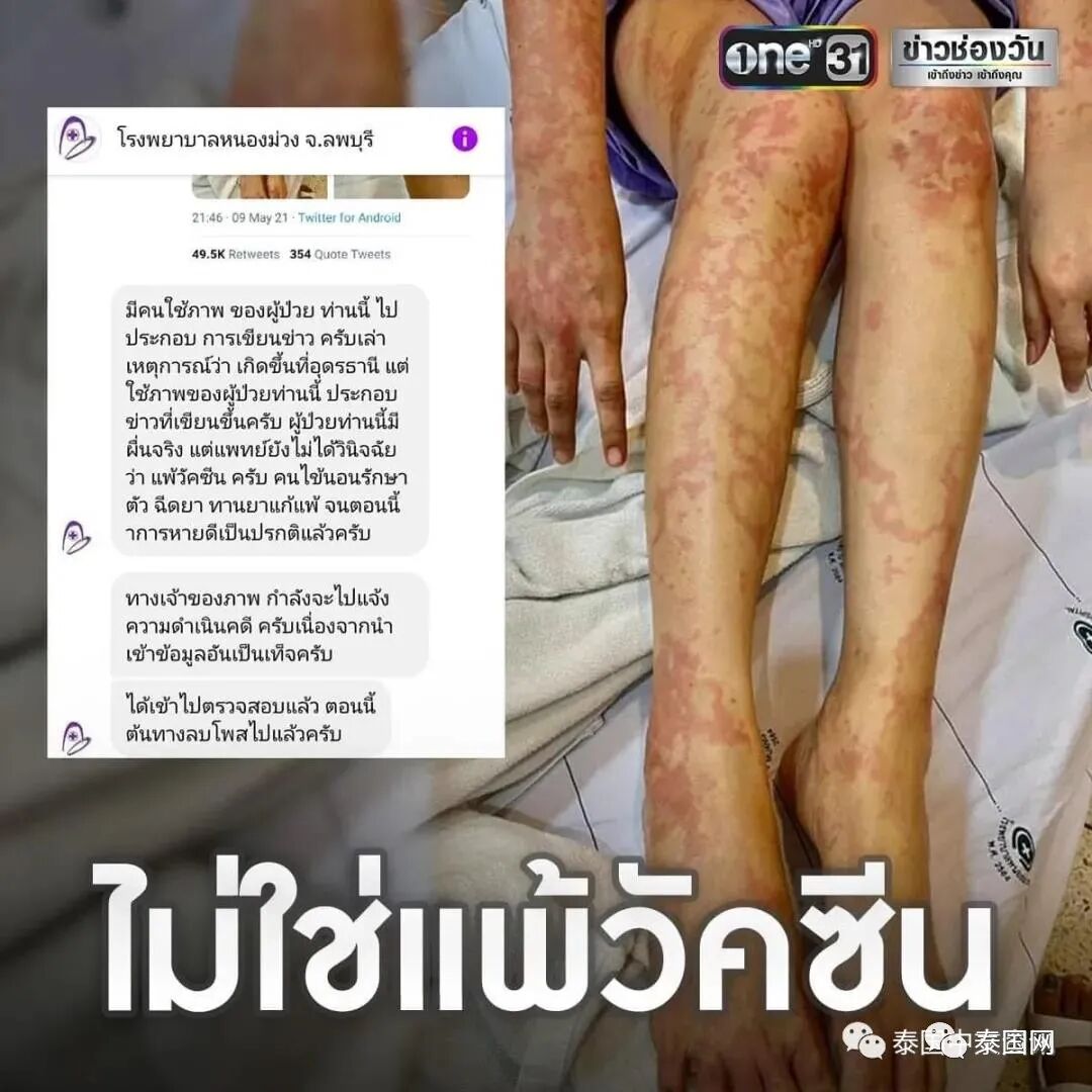 院方证实,发帖的泰国女子所使用的的图片,根本不是什么“接种疫苗后的不良反应”,而是该医院一名红疹患者的治疗图片。