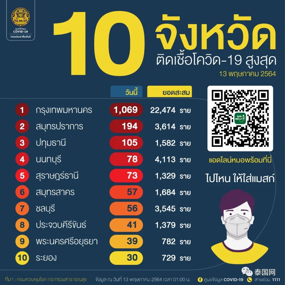 另据了解,5月13日泰国春武里府卫生办公布了该府疫情情况,该府新增56例确诊病例,新一轮疫情暴发以来该府累计确诊3547例,累计治愈2153例,累计死亡11例。