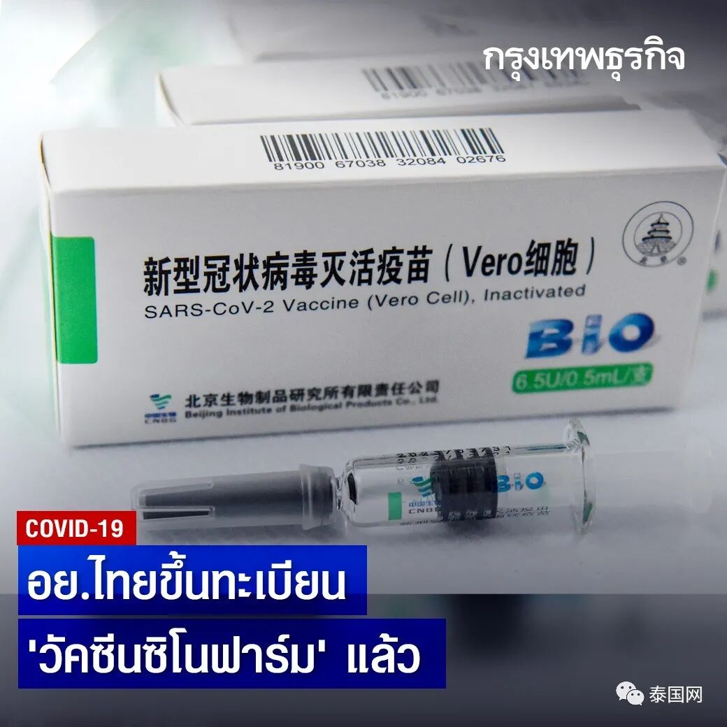泰国网报道,5月28日,泰国食品药品监督管理局(FDA)秘书长派讪透露,FDA已批准中国国药集团中国生物北京生物制品研究所研发生产的新型冠状病毒灭活疫苗的注册申请。