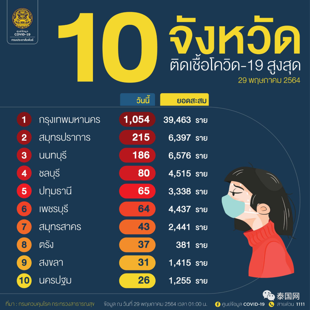 泰国今日新增新冠确诊Top10府域公布!