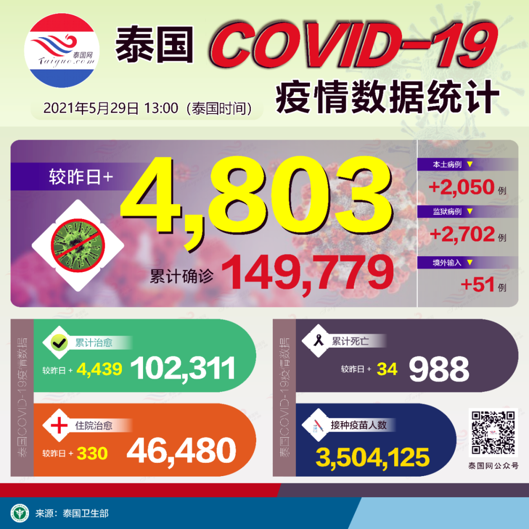据疫管中心5月29日消息,泰国今日新增4803例新冠确诊病例,本轮疫情累计确诊120916例,疫情暴发至今累计确诊149779例;新增治愈4439例,本轮疫情累计治愈74885例,疫情暴发至今累计治愈102311例,尚有46480例在院治疗;新增死亡34例,本轮疫情累计死亡894例,疫情暴发至今累计死亡988例。