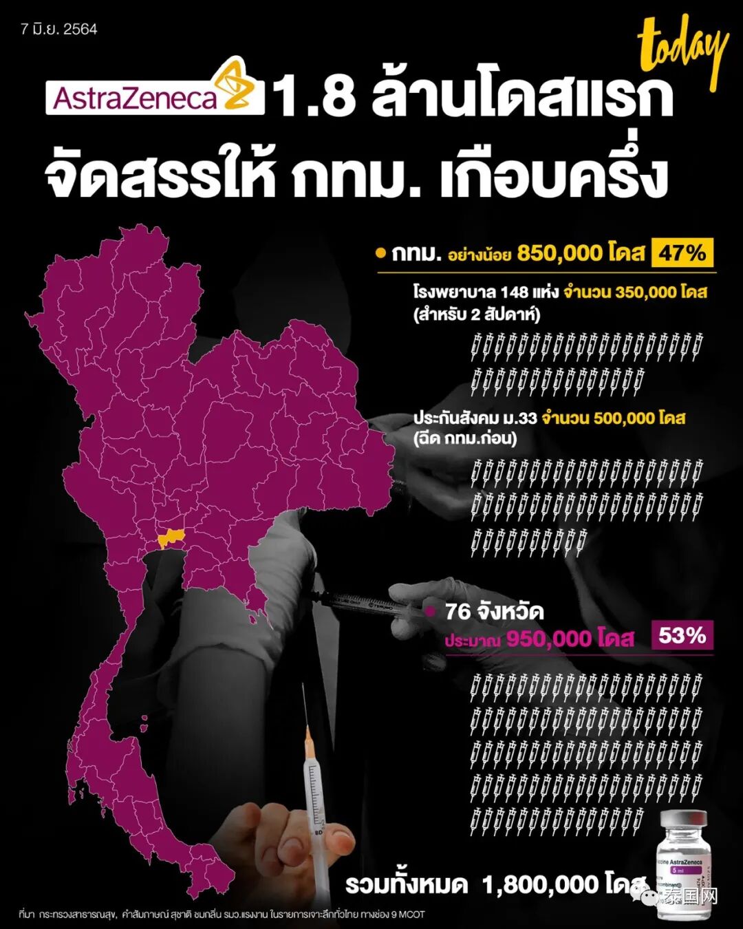 为配合接种计划,该批180万剂阿斯利康疫苗已全部分配下去,其中850000剂已分配至首都曼谷(曼谷148家医院获350000剂、曼谷社会保障办公室45处接种点获500000剂),其余950000剂被分配至泰国其余76府。