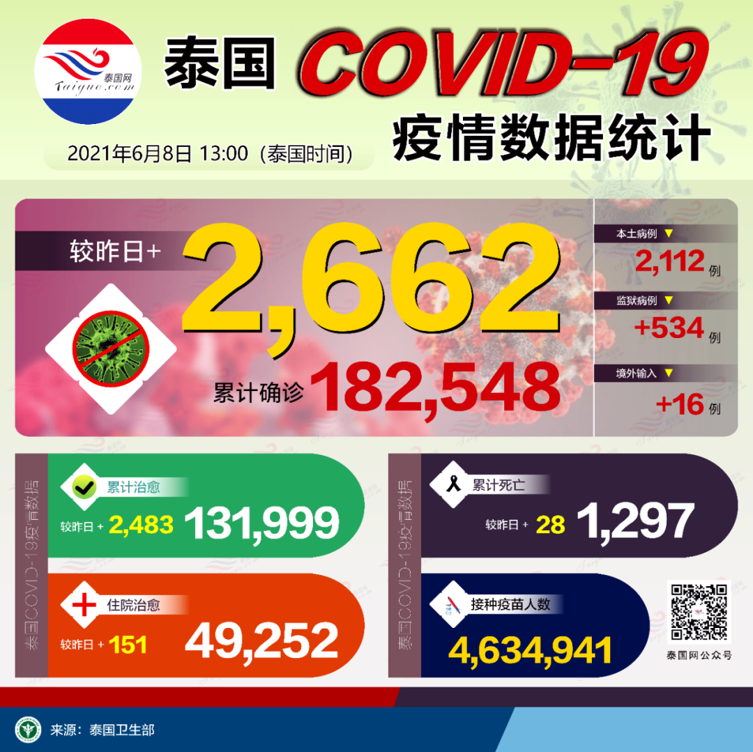 6月8日据泰国疫管中心消息,泰国新增2662例确诊病例,自新冠疫情暴发以来至今累计确诊182548例;新增2483例治愈病例,累计治愈131,999例;新增28例死亡病例,累计死亡1297例。