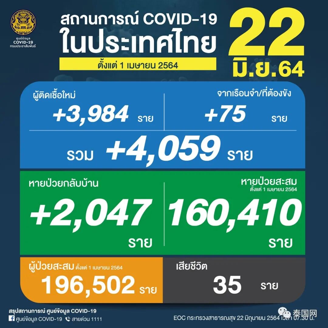 4月以来第三轮疫情泰国累计确诊196502例。新增治愈2047例,第三轮疫情累计治愈160410例。新增死亡35例,第三轮疫情累计死亡1599例。