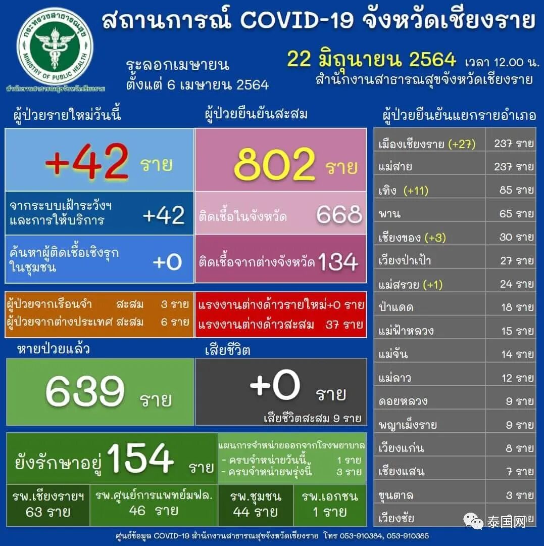 据泰国清莱府卫生办22日消息,清莱府新增确诊42例,累计确诊802例,无新增死亡病例。