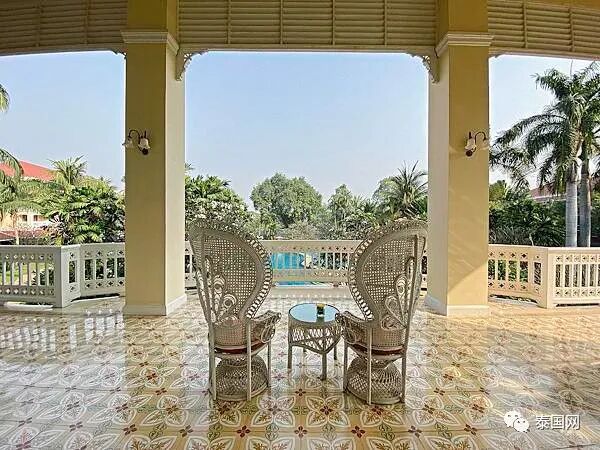 最显眼的地方,供着一红皮木椅,用金色的围栏隔开,也不知道当年哪个泰国皇亲国戚坐上头办过入住。