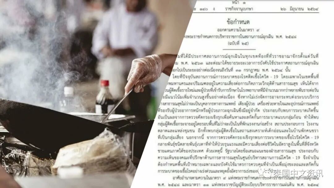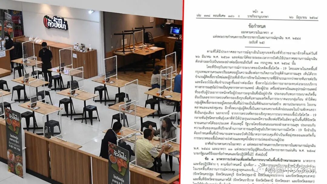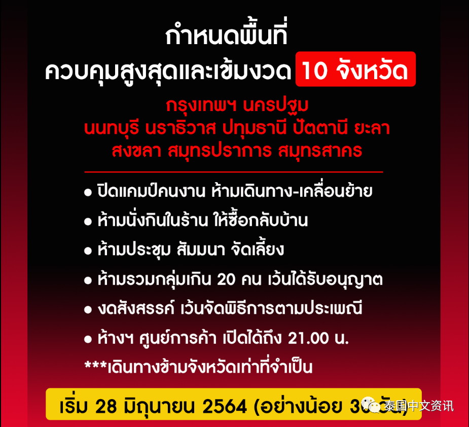 泰国网报道,据泰媒消息,6月26日泰国政府公报网对外发布了由泰国总理兼国防部长巴育上将签署的新冠疫情防控措施的最新公告,公告内容适用于包括曼谷、佛统、暖武里、巴吞他尼、北榄、龙仔厝及南部4府(陶公、宋卡、也拉、北大年)在内的疫情“重灾区”10府。公告内容大致如下:
