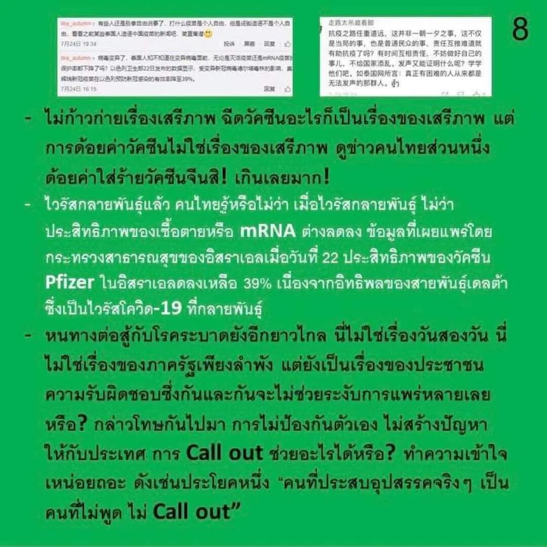在帖子里,他说:“最近在一家泰国的中文通讯社‘泰国网’上可以看到很多中文的评论。中国人的评论很有趣,体现了他们对泰国的看法,那些反中国疫苗的泰国明星应该好好看看——如果我是泰国艺人,说中国疫苗的坏话时,可得小心点。”