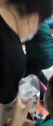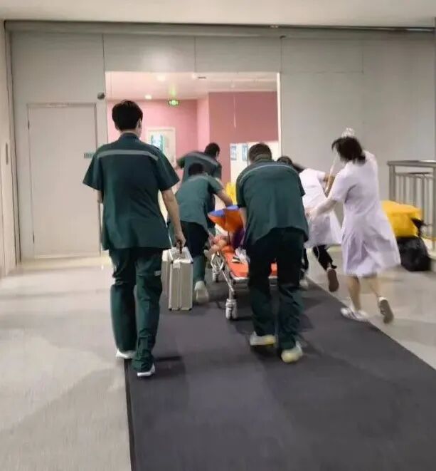 医院急诊科医生唐露丹接到急救电话后,迅速赶到现场,对患者实施抢救。由于情况紧急,在前往急诊科抢救室的路上,唐露丹直接跪在担架车上,为患者进行心肺复苏和AED除颤。最终,在医院门诊部、服务中心、急诊科的医务人员与四楼出诊的医护人员通力配合下,患者恢复了心跳,转至ICU病房继续治疗。