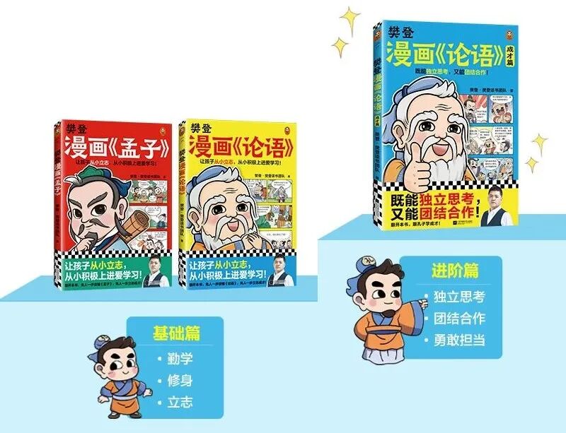 这时候,一本兼具趣味性、故事性,并且知识点满满的书就很重要了!今天,樊登读书隆重向大家推荐一套“超级不得了”的书—— 樊登老师亲自参与制作的《樊登漫画<论语><孟子>》 + 《樊登漫画<论语>:成才篇》。 2022年,漫画版《论语》《孟子》一经出版,就成了很多家长的“眼中宝”,拿下京东、当当多个平台的榜单第一。