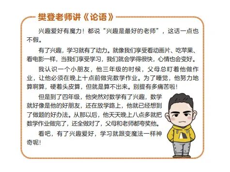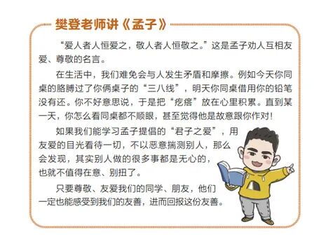 分别在《论语》《论语:成才篇》和《孟子》中,各自选取了28段孩子上学时会学到的、用到的经典名句。并附加注解,把异读字和通假字注了音,帮助孩子无障碍阅读和理解。在一定程度上,也为孩子的文言文阅读和语文教育打下基础。除此之外,在每段故事最后,我们还特设了 “樊登讲论语/孟子”“国学小课堂”两大知识拓展版块。在“樊登讲论语/孟子”版块,是樊登结合现实生活的应用解读。多种孩子成长中会遇到的小问题,他都会贴心解读和加以引导。在“国学小课堂”版块,则会延展出各类国学趣味知识:既能帮助孩子结合现实生活、自身成长,学习和运用国学智慧;又能给他们科普国学知识和历史见闻。当然,以古圣先贤为榜样,还能帮助孩子从小树立健康的三观,培养积极正面的好心态!![]()