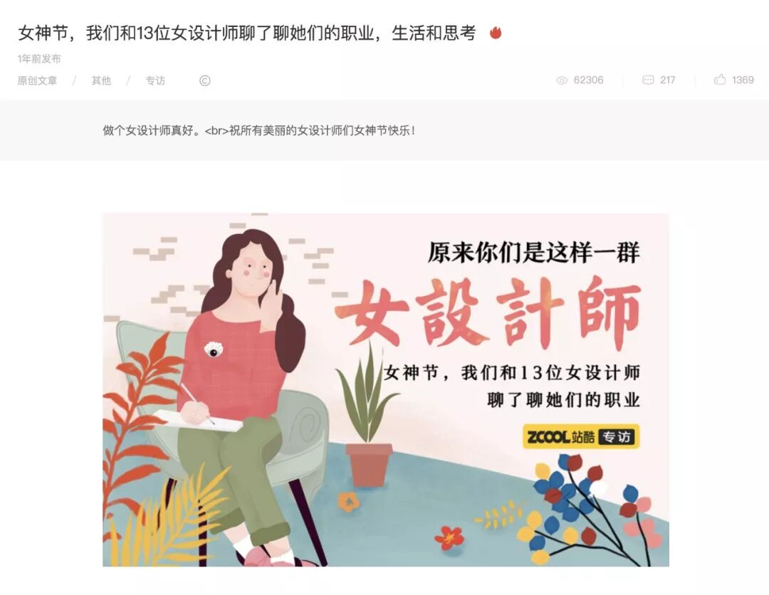 我想起来2017年38节的前一个月,有一位站酷编辑找到我,做了一个采访,内容就是关于女设计师现状和改变现在的调查,她们采访了包括我在内的近13名不同领域的女设计师,策划了一个女神节特辑,感兴趣的话可以去看看: