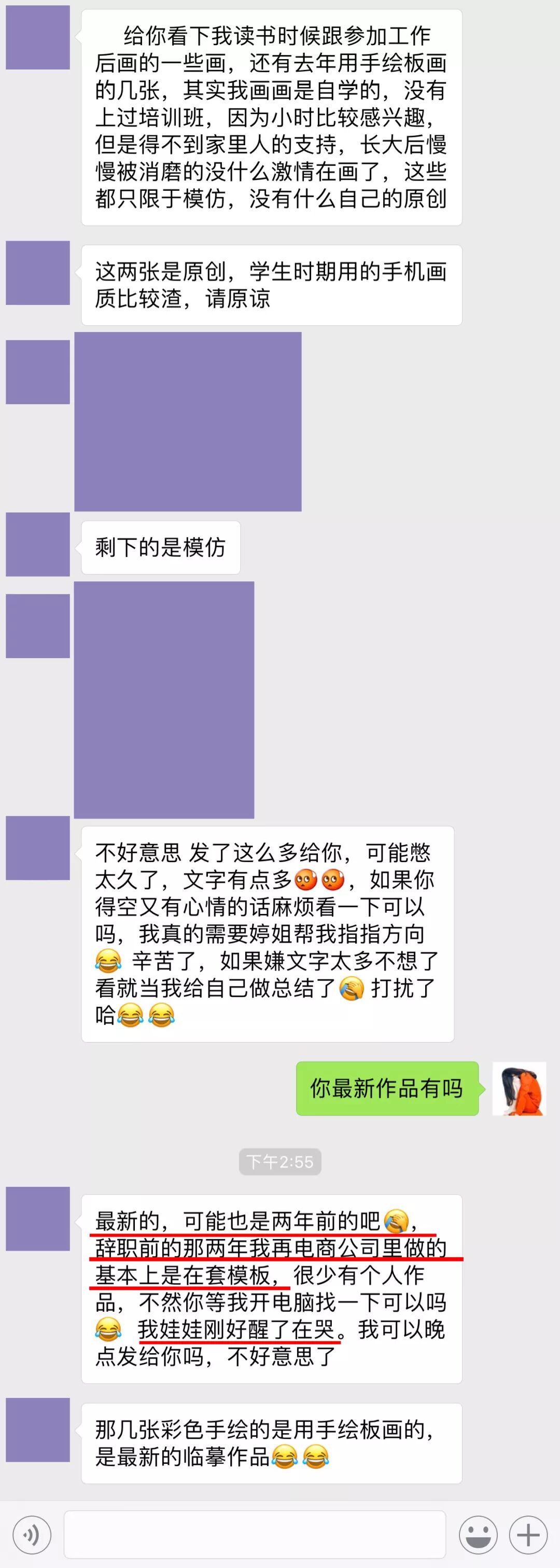 而且我发现一个细节,就在这位面粉问我问题这一小会儿,孩子又哭了,她连打开电脑给我发下作品看看的时间和功夫都没有。