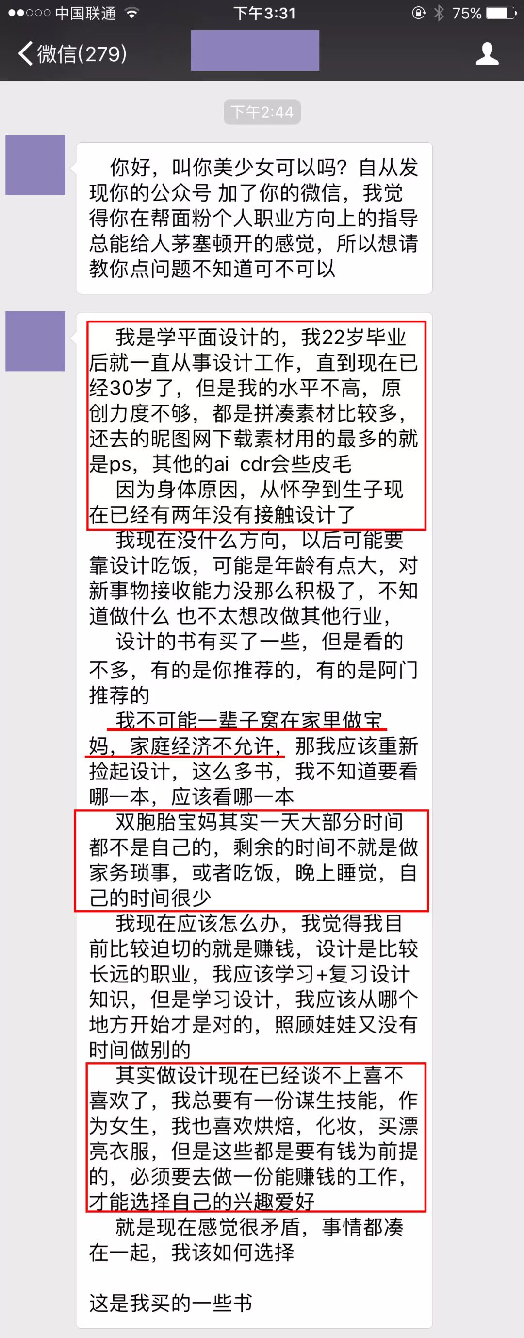 这名女设计师是一名双胞胎宝妈,同样也已经30岁了,而且怀孕生小孩后就一直在家带孩子,目前脱离职场已经2年了,又因为要照顾小孩打理家务,平时根本就没有时间去工作或学习充电,等意识到家里需要巨大的经济开支之后,才意识到自己需要重新出去找工作了,可此时的自己已经基本没什么竞争力,因为原本能力水平就一般,这一生孩子耽搁了几年已经接近荒废了。