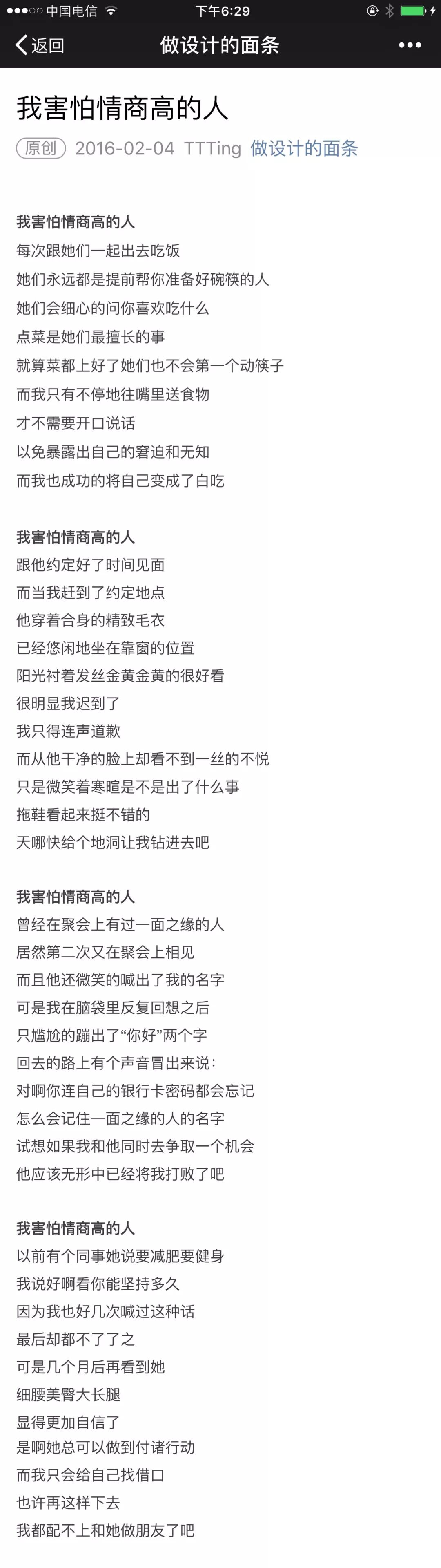 以前的我经常会写一些很情绪化的文字,而且我非常讨厌自己当时的性格和生活状况,我时常怀疑自己情商极低,我是一个连自己都不爱自己的人,所以我写下来了这篇文章:《我害怕情商高的人》。