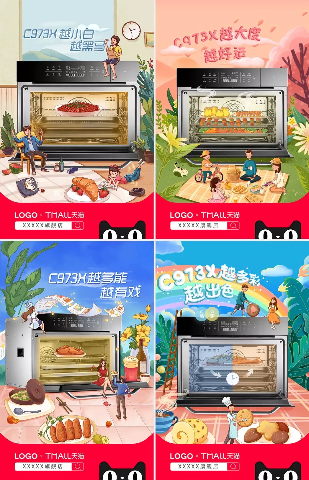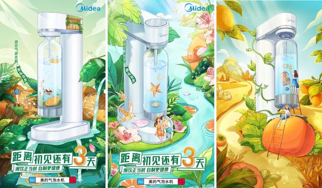 另外,数码家电品类其实也是可以考虑手绘的,而不是仅仅只能玩C4D或者科技路线,比如下面这组美的这一系列新品宣传海报,就非常的有创意,夺目,并且可以根据不同的人群定位或结合IP热点做不同的创意表现。