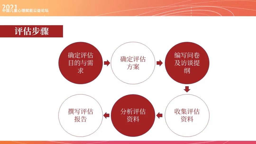 首先要选择适当的评估类型,如何选择适当的评估类型?简单来说,就是明确你的目标是什么。比如说,当我知道这些孩子的需求是什么,我就要去开发一套服务有针对性地解决孩子的问题,那你就一定要用到需求评估。当这个项目或服务开展之后,我想要看效果怎么样,这个效果跟我们项目的开展有没有关系,我就要用到结果评估。当我们想看一个项目的性价比,即投入产出比,那我就要用到效率评估。所以不同的评估目标、不同的评估时间以及项目的具体要求,决定了我们的评估类型是完全不一样的。