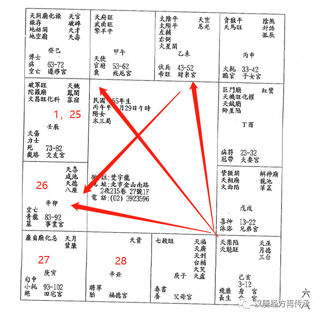 天喜星在巳宫,红鸾星在亥宫,天喜和红鸾一定是对宫。她是壬辰年出生,1岁,25岁在戌宫,30岁在巳宫,30岁会有婚姻。她35-44还有红鸾星来会,但这是第二次,不是第一次。批女孩子的命,福德宫很重要,像她福德宫很好,福德宫不好的话,第二次婚姻都很难。福德宫很好,第一次会结婚,小流年30岁逢到天喜星,就会动。她27岁也会到太阳,可是28岁是化忌,没有过忌婚事不成。就会发生一些事情,让她想结婚但结不了。过了忌以后,遇到红鸾天喜星就会结婚。可是她本身是偏房命,诸位算命特别要注意这个格,其他的都很简单,男女同格。就像中医看病一样,男女都一样,女孩子比男孩子多了个妇科。38岁来算命的,她38岁时,先生过世,夫妻死别。死别前的阳宅,西北角是厨房。先生死后,她很难过,先生意外死亡,又换了个房子,西北角是主卧室,西南角是厨房。太阳代表先生,儿子,爸爸,她38岁进入父母宫,也等于进入夫妻。跟她同时间生的人,有的不会有事,有的会有事,决定在阳宅上面。一个阳宅住进去,三六的数,快了三年,慢到第六年,一定会成灾。第三年开始,所以,她住这个房子,第三年先生就走了。三年过去没事,第六年就第二个灾。所以这个宅很凶。
