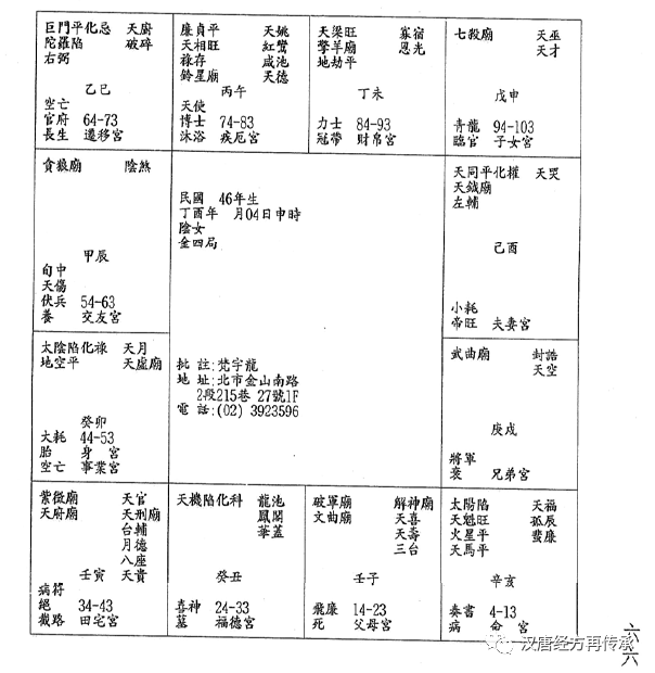 3,父母宫是破军,或者廉贞破军等杀星,代表父母亲会离散。她太阳星陷地,太阴星化禄,代表她从小是由她母亲抚养她的。看相,相上有两种状况,第一个,日角陷主丧父,月角陷主丧母。如果有的人官运很好的时候,日月角会挺起来,这时候要看眉毛,左眉主父亲,右眉主母亲,高着先丧。如果看一个人,两个眼睛是一样的,左眉比较低,右眉比较高,代表妈妈先走,如果左眉比较高,代表父亲先不在。两眉都比较高的话,就没有后顾之忧了。所以看当官的,两个眉都抬起来,就没有了。如果两个眼睛一高一低,代表庶出,领养的。还有,八字上面也可以看到,父亲早逝。4,这个八字的格,还有另一个解释,女孩子拿到男孩子的八字,所以她一辈子要像男人一样辛劳。巨日格的人,她的命一定主偏房,偏房格,一定会进入偏房的大运。这个八字早年要丧父。5,14-23岁的时候,进入破军星,代表一个人很辛苦的出来做事,工作,这个人一定读书读得不多,跟她的母亲相依为命。6,24-33这段时间化科,化科代表读书,化科最好是在14-23岁读书的时候化科最好,但这段时间没有化科,对面是禄存。24-33才化科,这就是比如空中大学,或者她到社会上来学到专业技术专长,这段时间因为化科,她帮人家做事领固定的薪水。7,进入34-43岁,南北斗星君来会,统统是吉星来会,代表她34-43岁会自己做事业当老板,她的事业会非常顺。他44-53岁又进入事业宫,如果事业宫太阴星没有化禄,她身宫在事业宫,事业宫讲的是官禄,如果没有化禄的话会当官,有化禄的话会从商,连续三十年,贪狼星也是横财,从商的运道会很好。这是他的事业,做生意。8,子女宫,七杀星代表一个儿子,她一个儿子在旁边。9,他的天喜星在子宫,红鸾在午宫,14-23岁,早年天喜红鸾星就来会,所以第一次婚姻会比较早,为什么?因为她早年丧父,没有父亲的依靠,没有安全感,想早点成家。