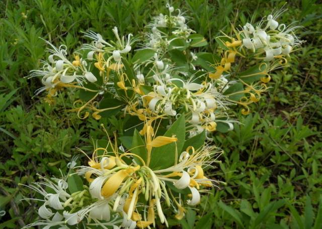 金银花,三月开花,五出,微香,蒂带红色,花初开则色白,经一、二日则色黄,故名金银花。又因为一蒂二花,两条花蕊探在外,成双成对,形影不离,状如雄雌相伴,又似鸳鸯对舞,故有鸳鸯藤之称。