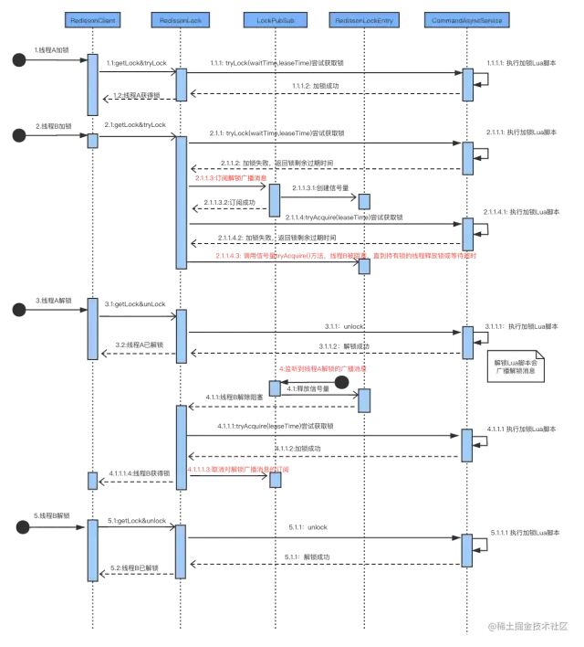 而当线程1释放锁之后(这里依旧有通过Pub/Sub发布解锁消息,通知其他线程获取)