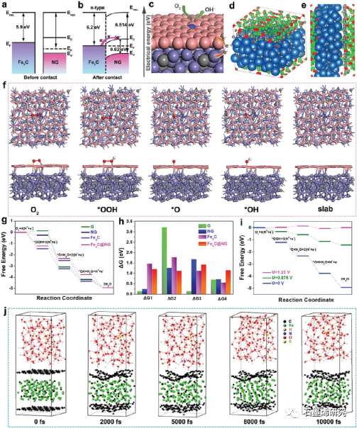 Figure 4. Fe3C@N/MCHSs催化剂电子结构表征及理论计算。(a,b) Mott-Schottky异质结接触前和接触后Fe3C和NG的能带图;(c) ORR催化机制;(d, e) Fe3C@NG模型的电荷分布;(f) Fe3C@NG模型上的ORR过程;(g) 能量阶梯示意图;(h) G,NG,Fe3C和Fe3C@NG不同活性位点在ORR催化过程中各步骤的能量变化;(i) Fe3C@NG在不同势能下的能量分布图;(j) Fe3C@NG在0.5 M H2SO4溶液中的分子动力学(MD)模拟。