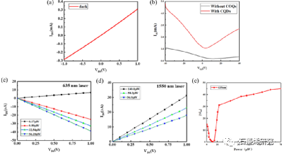 图2. PbS -石墨烯器件的电气和光学测试。(a) I-V特性(b) PbS量子点薄膜组装前后的传输曲线。(c) (d) 635 nm和1550 nm激光在不同功率密度下光电流随偏置的变化。(e)光电流对激光功率照射的依赖性。