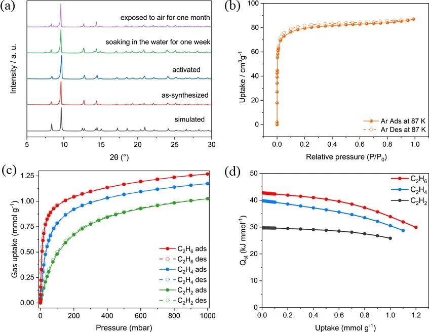 图2. 不同处理条件得到Zn-FBA 的PXRD谱图;(b) 87 K下Zn-FBA 的Ar吸脱附曲线;(c) 298 K时,Zn-FBA 对乙烷、乙烯和乙炔的吸附等温线;(d) Zn-FBA对乙烷、乙烯和乙炔的等量吸附热。