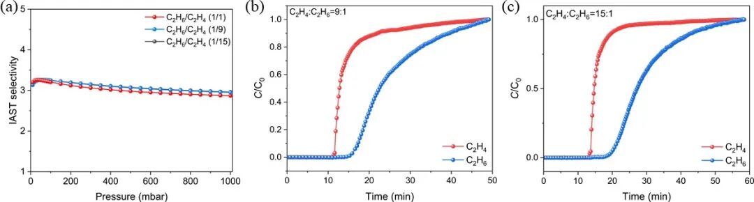 图3. 298 K,Zn-FBA对乙烷/乙烯气体比例分别为50/50、10/90和1/15时的IAST吸附选择性;273K时,Zn-FBA分离1/9(b)和1/15(c)乙烷/乙烯混合气体的穿透曲线。