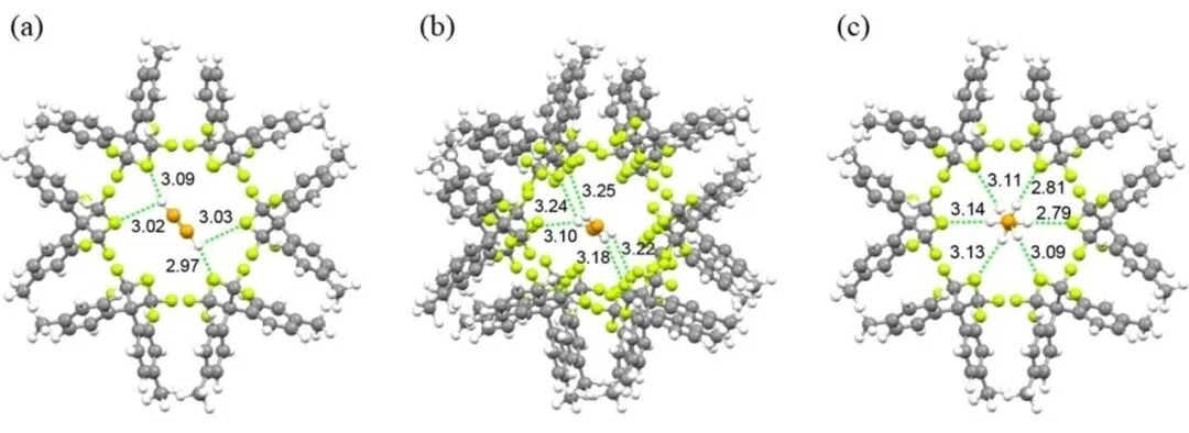 图1. C₂H₂、C₂H₄和C₂H₆的吸附位置,键长单位为Å,骨架中的碳、氟和氢原子分别用灰色、绿色和白色表示,吸附物中的碳和氢原子分别用橙色和白色表示。