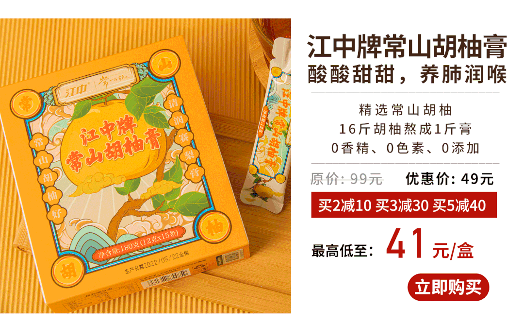 江中品牌正是看中了常山胡柚强大的功效作用,选择与一份常礼强强联合,造就了这款止咳润肺的「江中牌常山胡柚膏」。