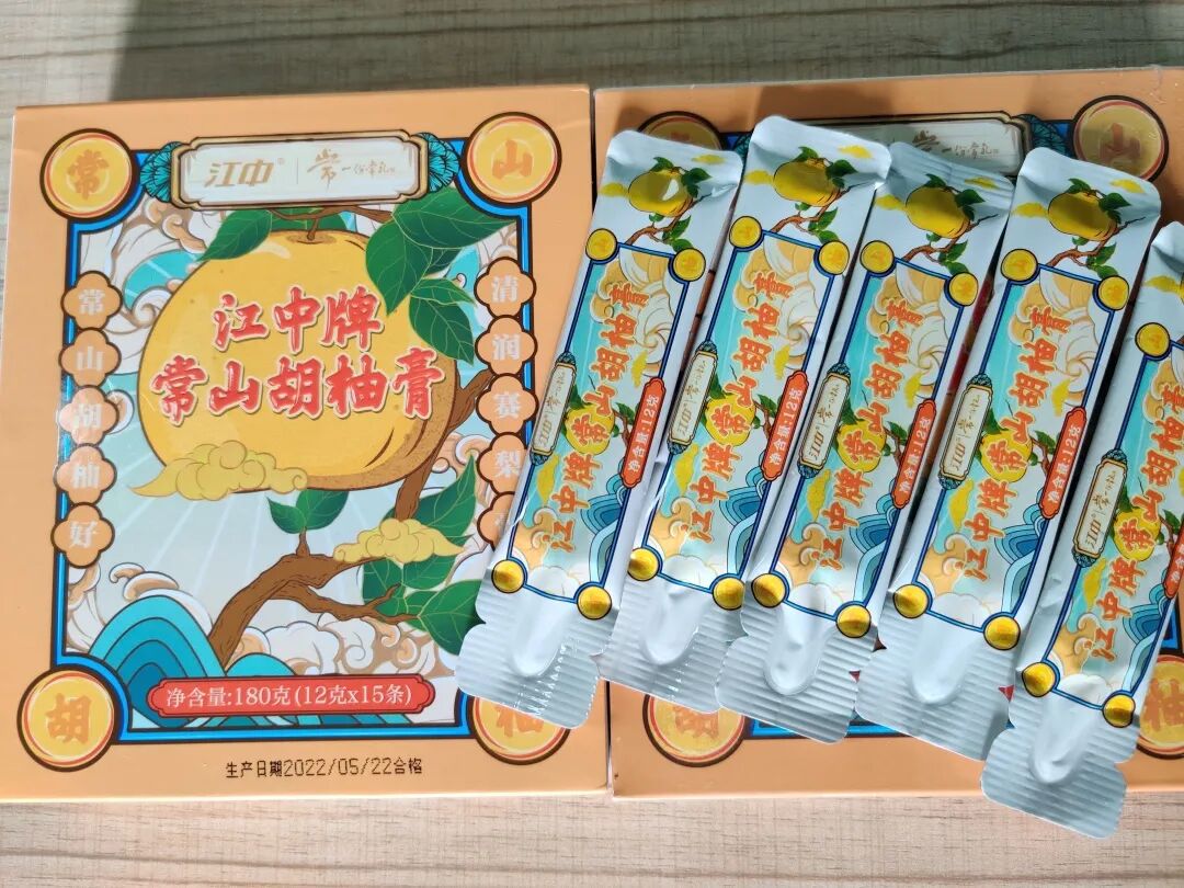 正好,老爸前几天给我寄了几盒「江中牌常山胡柚膏」,说是江中集团跟老家那边合作开发的产品,使用的原料都是老家常山正宗的胡柚。