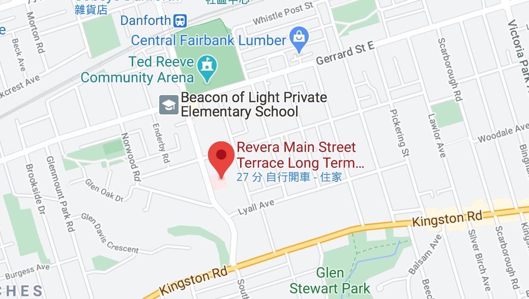 该养老院位于Kennedy和Ellesmere附近,地址:1400 Kennedy Rd, Scarborough, ON M1P 4V6。