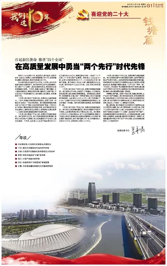 10月14日,杭州日报“喜迎党的二十大 · 钱塘篇”专栏刊发区委书记金承涛署名文章《扛起新区使命 推进“四个全域” 在高质量发展中勇当“两个先行”时代先锋》,表达了钱塘将牢记嘱托、感恩奋进,扛起高能级战略平台的使命担当,大力推进全域创新、全域智治、全域美丽、全域共富,建设现代化国际化一流新区,在高质量发展中勇当“两个先行”时代先锋,以优异成绩迎接党的二十大胜利召开。全文内容如下: