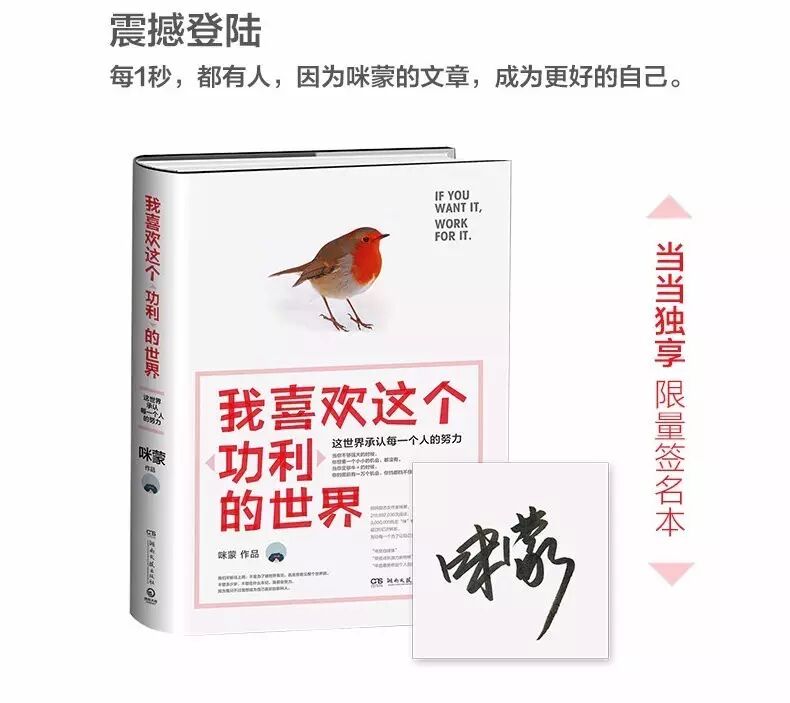 日前,咪蒙的新书《我喜欢这个“功利”的世界》已全面上市。从55日晚预售至今售出17万册,预售当天更是创下1分钟卖出1000册、4小时卖出5万册的成绩。时过数日,这本书在多个售书平台的热卖榜上仍排在首位。