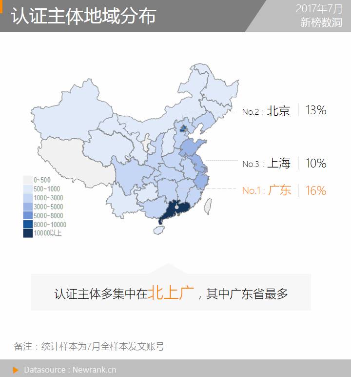 本次统计样本为已被纳入新榜样本库且7月有发文记录的234239个活跃公众号,公众号微信认证信息更新于6月。统计结果或由于样本的局限性和数据的时效性带来统计偏差,但整体仍具有参考性。