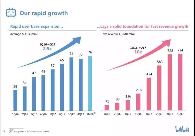 虽然仍未实现真正盈利,B站在商业化上的潜力已经体现在招股说明中:2017年总营收24.68亿元人民币,同比增幅达372%;2018年前两个月平均月活跃用户(MAU)7600万,2017年活跃用户平均在线时间76分钟。