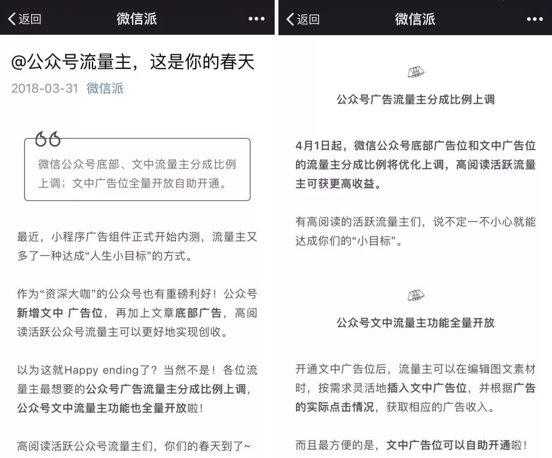 3月31日,“微信派”推文表示公众号运营者的“春天”来了:从4月1日起,公众号广告分成比例将优化上调,高阅读活跃公众号可获更高收益;不仅如此,文中广告也全量开放,再助运营者们一臂之力。
