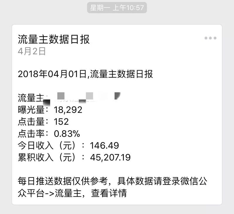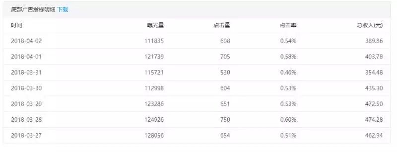 可以发现,公众号的相关数据有曝光量、点击量、点击率和总收入,不过收入多少,很大程度上取决于点击单价,即收入与点击量的比值。