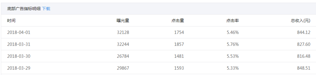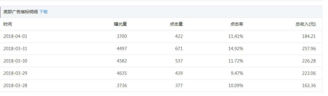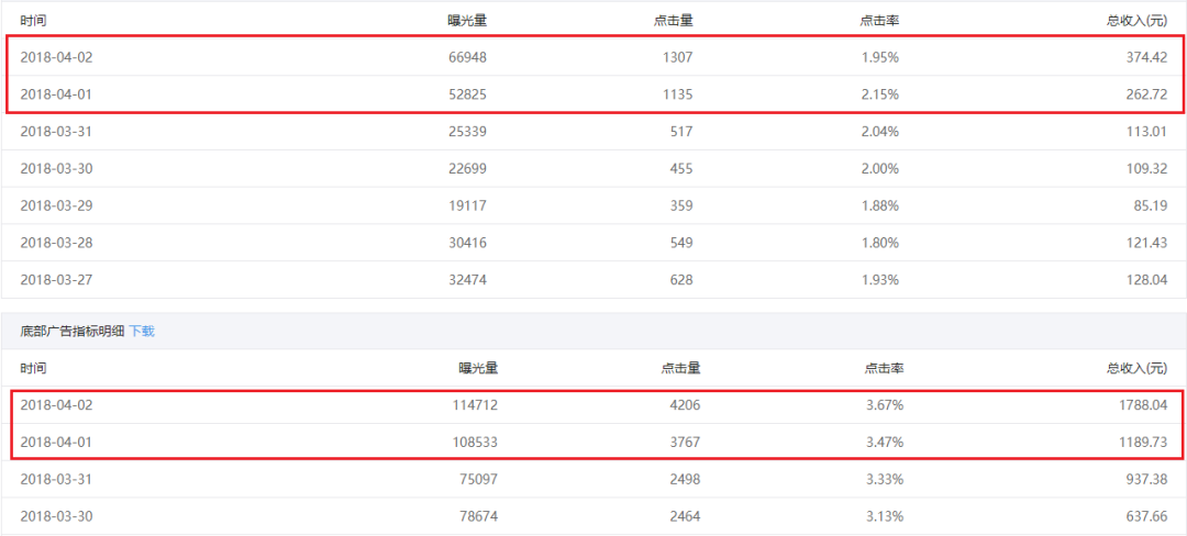 比如文中插入广告的收入从之前的一百左右,上涨到两三百。而底部广告在4月前每天收入不到一千,至4月2日达到了1788元,单价超过4毛。