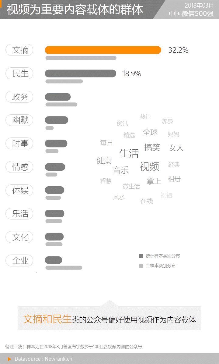 究竟是哪些公众号偏好使用视频来传递信息?以2018年3月发布视频内容且内容少于100字的公众号为例,新榜共计获取到43107个公众号,这其中有约一半的公众号为文摘类和民生类。剔除当月活跃发文的全样本类别分布影响,也能明显发现,文摘、民生和幽默类的公众号确实有更高的视频偏好意愿。进一步对上述43107个公众号名称作词频分析,以音乐相册、生活技巧和搞笑视频为主的营销号身影频现。