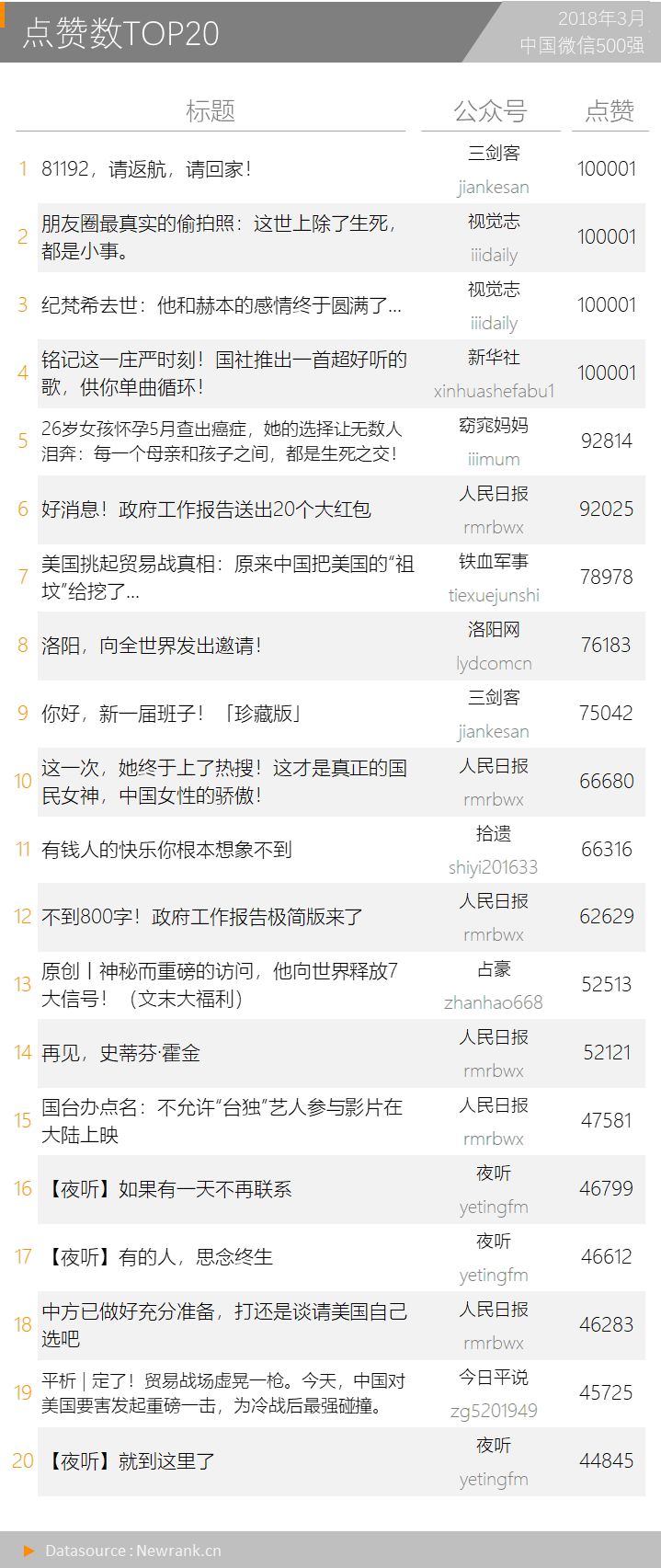 “人民日报”日均推送12次,“视觉志”收获2篇10万赞,节后数据全面回暖 |中国微信500强月报(2018.03)