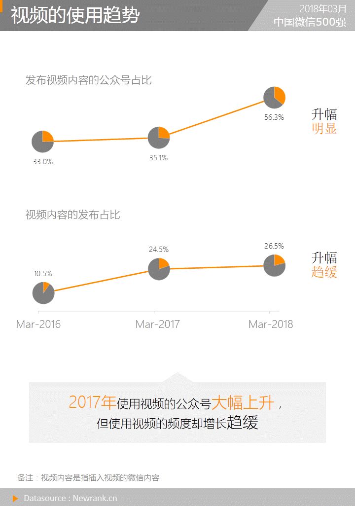 新榜选取2016年3月、2017年3月、2018年3月全样本发布的视频内容作为研究对象,试图观察近3年来公众号的视频使用情况,探究短视频持续火爆,对微信内容生态的影响。