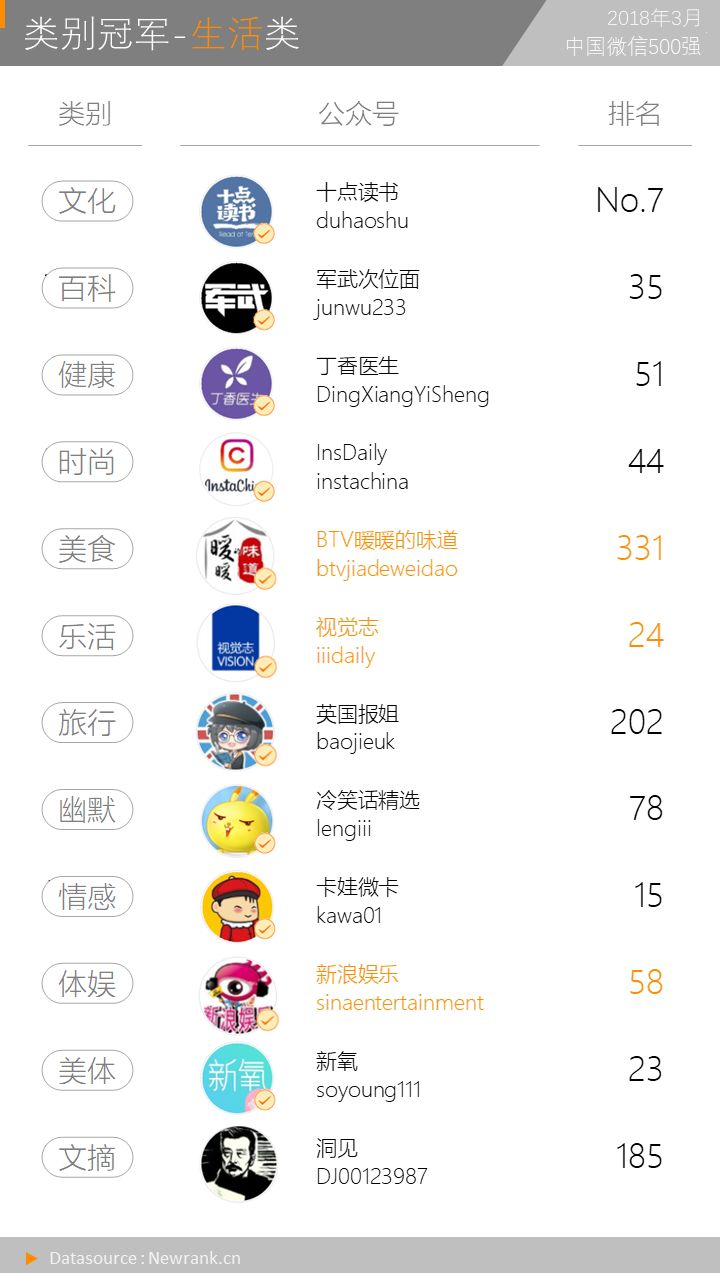 3月500强类别分布于不含楼市和学术的22类,有5类别冠军换员,分别是民生类别(“杭州交通918”取代“FM93交通之声”)、创业类别(“36氪”取代“创业邦”)、美食类别(“BTV暖暖的味道”取代“美食台”)、乐活类别(“视觉志”取代“英国那些事儿”)、体娱类别(“新浪娱乐”取代“每日音乐”)