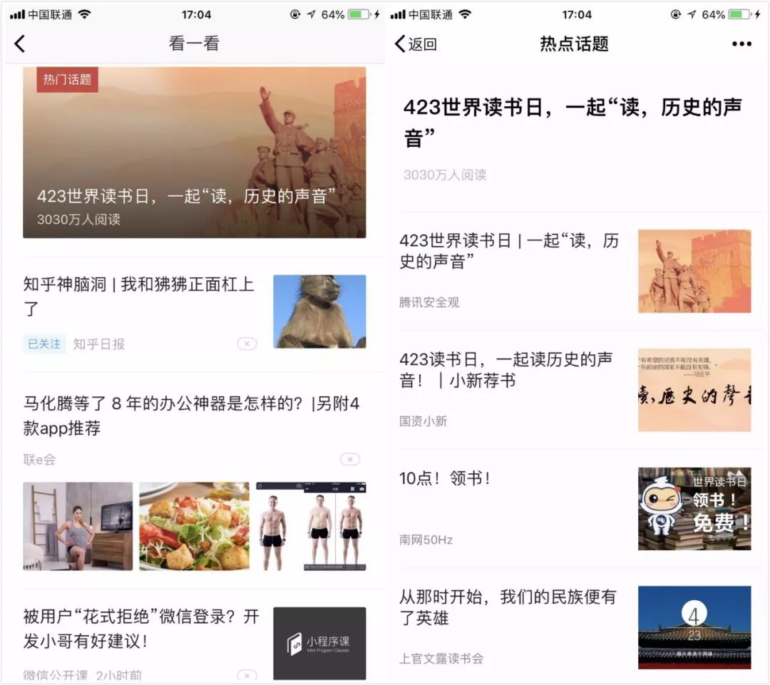 1. 2017年6月,微信“看一看”新增“热点话题”的标签和功能。