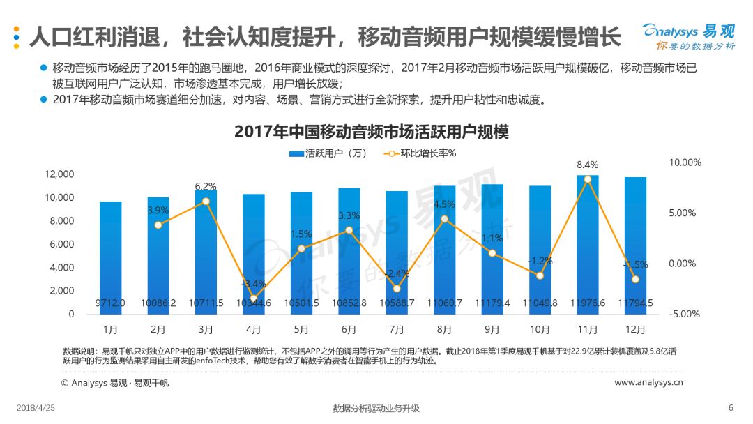 今年5月,易观的报告显示,2017年中国移动音频市场活跃用户规模接近1.2亿。蜻蜓FM总裁钟文明曾预测,2026年,音频市场的规模将达到1000亿元。