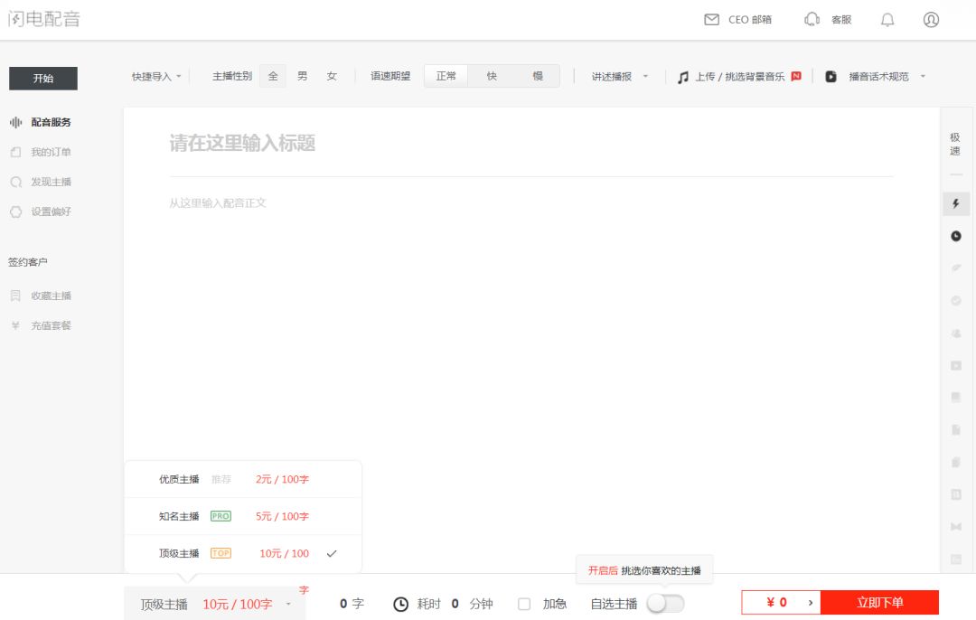 于是,“快”成了“闪电配音”的第一原则。“闪电配音”打出了千字/15分钟的交付能力,和最低2元/100字的价格。这意味着同样一篇2000字的文章,只需支付40元的配音费。只有顶级主播(10元/100字),才达到200元一篇——相当于上述配音工作室的价位。