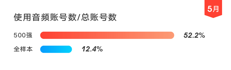 今年5月,这个数字提升了三倍。新榜数据显示,今年5月,“500强”样本中,52.2%账号的使用过音频功能,8.6%的文章中插入了音频。对比全样本,这两个数字分别为1.8%和12.4%。这或许说明,头部账号对新形态的探索及运用强于一般账号。